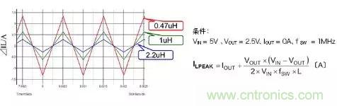 在這里,為加深對電感工作的理解,進一步說明電感值變化時電感電流如何變化的情形。下圖表示在相同工作條件下將電感值設(shè)為0.4μH、1μH、2.2μH時ILPEAK。