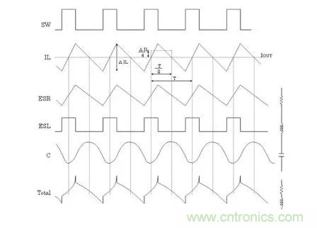 通過開關(guān)所產(chǎn)生的電感電流紋波ΔIL將產(chǎn)生與ESR成單純正比的紋波電壓,有些ESL則會產(chǎn)生方形波電壓,與電容值部分合成,最下方波形成為最終的輸出紋波電壓波形。