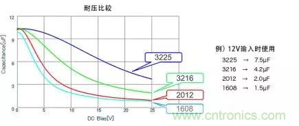 關(guān)于DC偏置,當然須選擇影響少的,不過即使電容值、耐壓相同,變動特性也會因封裝尺寸而異。下方圖表為其一例,顯示尺寸大者變動少。總之,請務(wù)必從電容器廠商取得充分的信息。