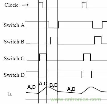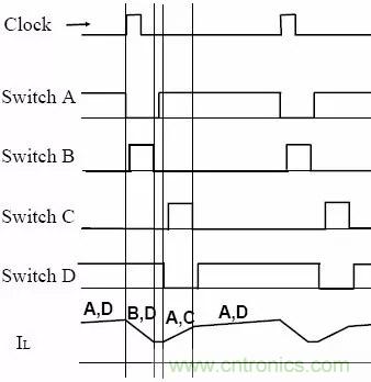 當(dāng)輸入電壓比輸出電壓低△V,即輸入電壓略高于輸出電壓時(shí),系統(tǒng)工作于降壓式BuckBoos模式。開(kāi)關(guān)周期起始時(shí),開(kāi)關(guān)管B/D先同時(shí)導(dǎo)通,然后A/C同時(shí)導(dǎo)通,最后是A/D同時(shí)導(dǎo)通,即開(kāi)關(guān)管導(dǎo)通的順序?yàn)椋築/D–A/C–A/D。