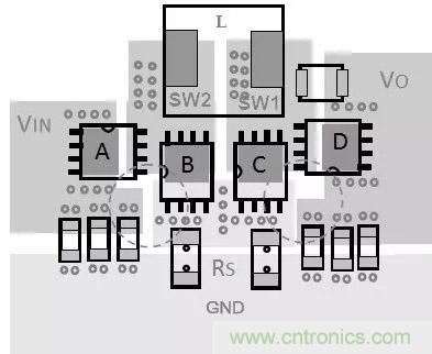 降壓Buck變換器的電感位于輸出回路,所以輸出回路的電流是連續(xù)的,輸入回路的電流是不連續(xù)的,輸入回路的干擾大,這些環(huán)路產(chǎn)生很大的磁場(chǎng)發(fā)射,因此輸入回路要盡可能的小。輸入回路的地為功率地,要與系統(tǒng)的信號(hào)地分開(kāi)單獨(dú)布線,輸出地可以作為干凈的信號(hào)地。