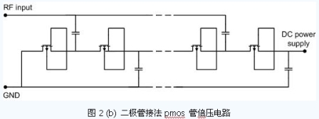 無源RFID 標(biāo)簽芯片工作時(shí)所需要的能量完全來源于讀卡器產(chǎn)生的電磁波的能量,因此,電源恢復(fù)電路需要將標(biāo)簽天線感應(yīng)出的超高頻信號(hào)轉(zhuǎn)換為芯片工作需要的直流電壓,為芯片提供能量。本文第2 部分將介紹電源恢復(fù)電路的設(shè)計(jì)。由于RFID 標(biāo)簽所處的電磁環(huán)境是十分復(fù)雜的,輸入信號(hào)的功率可以變化幾百甚至幾千倍,因此,為了芯片在大小不同的場強(qiáng)中均可以正常工作,必須設(shè)計(jì)可靠的電源穩(wěn)壓電路。本文第3部分將對(duì)電源穩(wěn)壓電路的設(shè)計(jì)進(jìn)行說明。調(diào)制與解調(diào)電路是標(biāo)簽與讀卡器進(jìn)行通信的關(guān)鍵電路,目前絕大部分的UHF RFID 標(biāo)簽采用的是ASK調(diào)制,本文在第4 部分對(duì)調(diào)制與解調(diào)進(jìn)行介紹。RFID 標(biāo)簽的控制單元是處理指令的數(shù)字電路。為使標(biāo)簽在進(jìn)入讀卡器場區(qū)后,數(shù)字電路可以正確復(fù)位,以響應(yīng)讀卡器的指令,必須設(shè)計(jì)可靠的啟動(dòng)信號(hào)產(chǎn)生電路,用來提供數(shù)字單元的復(fù)位信號(hào)。本文在第5 部分將討論啟動(dòng)信號(hào)產(chǎn)生電路的設(shè)計(jì)。