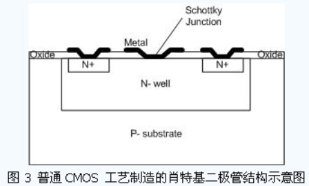 在一般的無源UHF RFID 標(biāo)簽的應(yīng)用中,出于成本的考慮,希望芯片電路適合于普通CMOS工藝的制造。而遠(yuǎn)距離讀寫的要求對(duì)電源恢復(fù)電路的功率轉(zhuǎn)換效率提出了較高的要求。為此,很多設(shè)計(jì)者采用標(biāo)準(zhǔn)CMOS 工藝來實(shí)現(xiàn)肖特基勢壘二極管,從而可以方便地采用多級(jí)Dickson倍壓電路結(jié)構(gòu)來提高電源轉(zhuǎn)換的性能。圖3 所示是普通CMOS 工藝制造的肖特基二極管結(jié)構(gòu)示意圖。在設(shè)計(jì)中,不需要更改工藝步驟和掩膜板生成規(guī)則,只需在版圖上作一些修改,就可以制作出肖特基二極管。