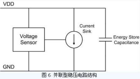 在輸入信號(hào)幅度較高時(shí),電源穩(wěn)壓電路必須能保證輸出的直流電源電壓不超過芯片所能承受的最高電壓;同時(shí),在輸入信號(hào)較小時(shí),穩(wěn)壓電路所消耗的功率要盡量的小,以減小芯片的總功耗。