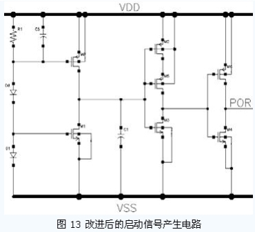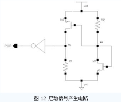 通常,無源RFID 標(biāo)簽進(jìn)入場區(qū)后,電源電壓上升的時(shí)間并不確定,有可能很長。這就要求設(shè)計(jì)的啟動(dòng)信號(hào)產(chǎn)生電路產(chǎn)生啟動(dòng)信號(hào)的時(shí)刻與電源電壓相關(guān)。圖12 所示是一種常見的啟動(dòng)信號(hào)產(chǎn)生電路。