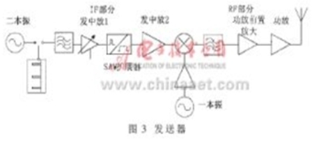 脈沖的擴(kuò)展:165MHz的本振脈沖,經(jīng)過開關(guān)截取0.1μs寬度的脈沖,經(jīng)放大?帶通濾波后,得到一個(gè)鐘形脈沖,送到SAW擴(kuò)展器。SAW擴(kuò)展器的激勵(lì)脈沖可以是一個(gè)寬度小于8ns的窄脈沖,也可以是一個(gè)帶有載波的鐘形脈沖,為了得到較大的功率,在此選用了鐘形脈沖。