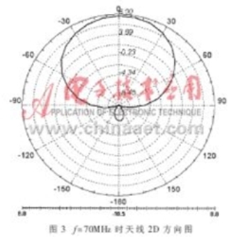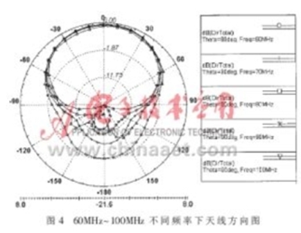 圖3為f=70MHz時天線的二維方向圖,從中可以看出,天線方向性系數(shù)達(dá)到7dB左右,而利用文獻(xiàn)中的圖表所查到方向性系數(shù)為6.5dB。圖4給出了幾個頻率下天線的二維方向圖,可以看出,各個頻率下方向圖形狀大致相同,但隨著頻率越靠近頻率范圍的上下限、方向圖背瓣越大。