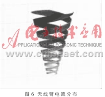 圖6表示頻率f=80MHz時電流在天線臂上的分布,可以看出傳導(dǎo)電流從天線饋電點(diǎn)(即圓錐頂部一端)流入,先經(jīng)過傳輸區(qū)(約下面的2圈),再向上是輻射區(qū)(約第3圈),最后為衰減區(qū)(后面幾圈)。在傳輸區(qū)內(nèi),電流大小變化不明顯,到達(dá)輻射區(qū)后,隨著大量能量以電磁波的形式傳播,電流迅速減小,最后經(jīng)過衰減區(qū),電流逐漸減小至零,這符合天線一般規(guī)律。其中,輻射區(qū)的位置與頻率有關(guān),即位于波長近似于圓錐截面周長的地方??梢韵胂螅煌l率會對應(yīng)不同的輻射區(qū)位置,這是CLS天線的工作特性,也是CLS天線具有寬帶特性的原因。