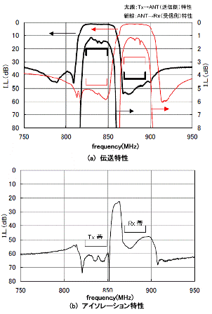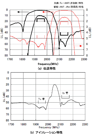 第二個例子,以圖2的BAND1(2GHz)收發(fā)雙工器(產(chǎn)品尺寸3.0×2.5×1.1mm)的特性為例。將特殊的設計技術引入到表面波難以實現(xiàn)低損耗的BAND1(2GHz)中來,在得到實際使用所需的隔離度的同時,還能實現(xiàn)Tx損耗1.4dB 和Rx損耗1.8dB這樣杰出的低損耗特性。一直以來,介質(zhì)收發(fā)雙工器在BAND1(2GHz)頻帶曾一度占據(jù)了主流的地位,而目前表面波做到了不亞于它的損耗值。由此,表面波收發(fā)雙工器替代了介質(zhì)收發(fā)雙工器成為了當今主流。