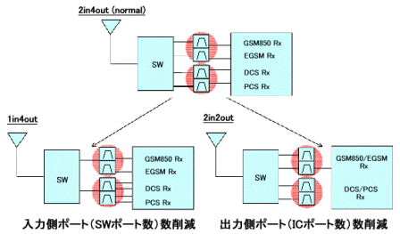 在手機的高頻率無線通信電路中使用的表面波濾波器,分為CDMA收發(fā)用的級間濾波器和GSM用的TOP濾波器等。村田的濾波器不僅具有低損耗和高抑制度的電特性,還由小型、薄型的各種產(chǎn)品尺寸構成了豐富的商品線,可以對應各種電路設計的需求。例如, 在多頻段發(fā)展的高頻無線通信電路中,為了減小電路基板上的貼裝面積,將兩個頻帶的單濾波器(產(chǎn)品尺寸1.35×1.05×0.5mm)合二為一,制造出了雙濾波器(產(chǎn)品尺寸1.8×1.35×0.5mm)。此外還運用特殊的技術制造許多獨特的商品,如將雙層濾波器的輸入端合并為一個的1in4out產(chǎn)品,以及將平衡器的輸出端合并為一的2in2out產(chǎn)品等。通過共用輸入端可以節(jié)省原本用于分頻的開關(SW)。同時,共用平衡輸出端可以使連接濾波器的高頻IC的端口數(shù)目減少(圖3)。這是在表面波濾波器的設計中通過調(diào)整阻抗和相位等方法,從而使差分端口實現(xiàn)共用。這些濾波器可以在多頻帶化發(fā)展的高頻無線電路中,為外圍電路的簡化及電路整體的小型化做出貢獻。今后村田制作所將繼續(xù)致力于研發(fā)更小型化和高性能化,同時又具有輸入端以及輸出端共用功能的單濾波器、雙濾波器產(chǎn)品。