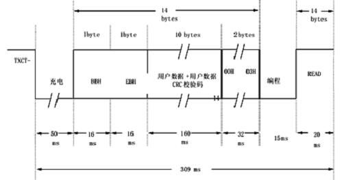 根據(jù)射頻信號的寫入格式,按照如下的寫入時(shí)序,即可將數(shù)據(jù)寫入射頻卡內(nèi)。見圖7.