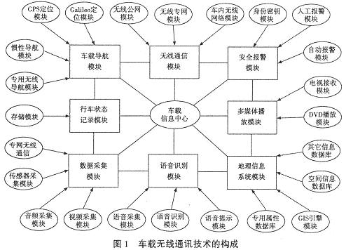 車載無線通訊技術(shù)由車載導(dǎo)航模塊、車載無線通信模塊、安全報(bào)警模塊、行車狀態(tài)記錄模塊、多媒體播放模塊、數(shù)據(jù)采集模塊、語音識(shí)別模塊、地理信息系統(tǒng)模塊八部分組成。所有的數(shù)據(jù)都通過車載信息中心進(jìn)行處理、協(xié)調(diào),并作出正確的反應(yīng)。圖l為車載無線通訊技術(shù)的構(gòu)成。