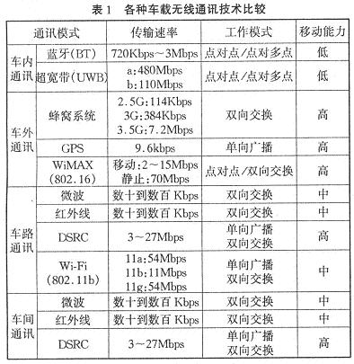 表1列出了四種模式下各種車載無線通訊技術(shù)的比較。