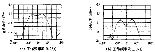 其中λC表示中心頻率對應的波長。最后得到該天線的實測結果如圖3、圖4所示。圖3(a)中的曲線1表示在HP8510B矢量網絡分析儀上測得的四臂螺旋天線的駐波比特性曲線,為了便于比較,在同樣條件下測得的八臂螺旋天線駐波比由曲線2給出,可見八臂螺旋能明顯地展寬天線的頻帶;圖3(b)表示在相同的儀器上測得的史密斯阻抗圓圖。此處我們根據要求將天線的頻帶設計在14%,而事實上可以做得更寬。圖4(a)和(b)分別為工作頻率取0.93fc和1.07fc(即圖3(a)中的標記2和3)時,由頻譜儀測出的遠區輻射方向圖,它們的半功率寬度分別達到140°以及145°左右,這么寬的波束是其它形式的天線很難達到的。