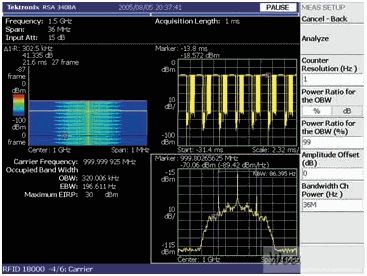 政府規定要求控制發射信號的功率、頻率、帶寬。這些規定防止有害干擾并保證每個發射者都是頻帶內其他用戶的友好鄰居。對于許多頻譜分析儀特別是通常用于脈沖信號能量測量的掃頻頻譜分析儀,進行此類測量是具有挑戰性的。RTSA 能夠分析一個完整的分組發射過程的能量特點,也能直接測量跳頻信號的載波頻率,而無需將信號置于一個跨度的中心。按一下按鍵,分析儀就能識別一個瞬時 RFID 信號的調制方式并能夠對功率、頻率和帶寬進行監管測量,使預一致性(pre-compliance)測試過程變得非常靈活和方便 [參閱圖2]。預一致性測試有助于確保產品一次通過一致性測試,而無需重新設計和重新測試。