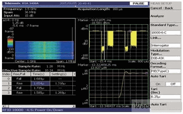 預編程測量能減少進行這些測試所需的建立時間。例如,ISO18000-6 C 類型的一個重要測量是啟動時間和關閉時間。載波能量上升時間必須足夠快以保證標簽采集到使其正常工作的充足能量。信號也必須迅速達到穩定狀態。發射結束時,載波能量下降時間必須足夠快,以防止其他發射受到干擾 [參閱圖3]。