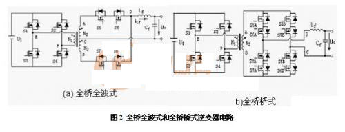 根據(jù)高頻逆變器(推挽式、半橋式、全橋式)、周波變換器(全波式、橋式)的組合不同,高頻脈沖交流環(huán)節(jié)逆變器具有6種電路拓?fù)洌渲腥珮蛉ㄊ?、全橋橋式電路如圖2所示。