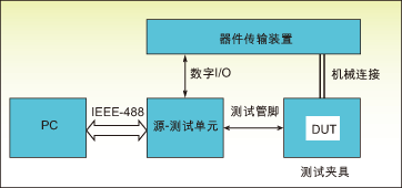 我們的第一個(gè)例子包括測(cè)試儀器、器件傳遞裝置(handler)和PC(圖1),這里需要注意如何通過(guò)內(nèi)部編程來(lái)消除大多數(shù)的GPIB通訊來(lái)加速測(cè)試。