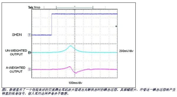 一個能夠接受、能夠檢測到的咔嗒聲抑制電平取決于多個因素:待測耳機/揚聲器的效率、人耳到轉(zhuǎn)換器之間的典型距離、SHDN循環(huán)頻率以及收聽時的背景噪聲電平等。