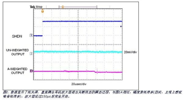 第二種瞬變過程,即直流耦合耳機放大器(圖2),似乎淹沒在A加權濾波之前示波器的噪聲底中。對于這種放大器,大部分音頻來自從關斷到完全工作時產(chǎn)生的直流失調(diào)電壓。由于失調(diào)只有幾個毫伏,沒有經(jīng)過濾波的信號不能精確決定咔嗒聲的大小。采用A加權濾波后,從噪聲基底中提取出直流耦合耳機放大器失調(diào)產(chǎn)生的咔嗒聲,獲得更客觀的測量結(jié)果。 (注意,沒有顯示濾波后的信號標度V/div。)