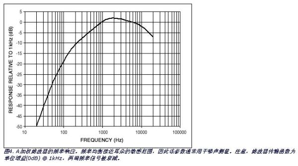 下一步,選擇分析儀的A加權濾波(建議)或非加權22Hz至22kHz濾波器,將測量帶寬限制在音頻范圍內(nèi)。請注意,示波器的快速高電平瞬變并不表明有多少能量出現(xiàn)在音頻頻帶內(nèi)。人耳對揚聲器或耳機瞬變信號的頻率響應很有限。因此,增加A加權濾波(圖4)更有利于分析,因為這樣增強了人耳敏感的頻率分量。某些音頻分析儀不能選用A加權,這種情況下,應限制人耳頻率響應的帶寬。音頻測試設備中常用的限制帶寬是22Hz至22kHz,帶寬限制濾波器大概能達到20kHz的平坦響應(通常為人耳的上限)。