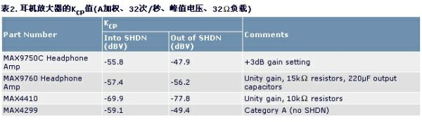 在很多應用中,盡管許多因素會影響可接受咔嗒聲電平的建立,我們還是可以規(guī)定一個可信的指標基準。注意,Maxim耳機放大器B類咔嗒聲的測試結(jié)果(表2),所有測試均采用一個32負載電阻,每一KCP值代表每個端口四次采樣的平均值。