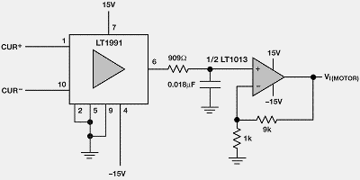 LT1991的低通RC網絡衰減100kHz(諧波)饋通,進一步提高電路的高頻共模抑制。由于電機線圈電感高,限制了電機電流的帶寬(帶寬限制量與電機型號相關,但不會接近100KHz),因此濾波時不會損失有用信息。感應電阻小,相應的電流感應電壓隨之減小,從而可限制電路的動態范圍,因此如果必要的話可提高LT1013的增益。當增益較高(大于100)時,需要用更大帶寬的變壓器替代LT1013。