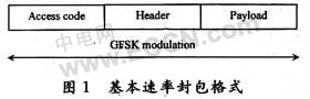 藍(lán)牙v1.2基帶數(shù)據(jù)封包中包含了存取碼、標(biāo)頭、保護(hù)時(shí)段(guard band)和負(fù)載(payload),如圖1所示。基本速率調(diào)變指的是GFSK,數(shù)據(jù)會(huì)以每個(gè)符號(hào)攜帶一個(gè)位元的方式,在1 Mb/s的資料速率下進(jìn)行傳輸,因此符號(hào)速率為1 Ms/s。資料會(huì)利用最小115 kHz的載波頻率中的位移或偏差,在RF載波上調(diào)變。高斯脈沖波形將-20 dB的頻寬維持1 MHz,頻譜利用率比BFSK高一倍。