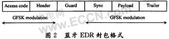 藍(lán)牙v2.0 EDR封包先在存取碼和標(biāo)頭的部分使用GFSK調(diào)變模式,但是,在保護(hù)時(shí)間5μs之后,負(fù)載部分則用π/4-DQPSK或8DPSK調(diào)變模式,如圖2所示。在保持指定的1 Ms/s符號(hào)速率前提下,增強(qiáng)速率分別提升資料速率到2 Mb/s或3 Mb/s,即每個(gè)符號(hào)發(fā)射二到三位碼元。通過測(cè)試發(fā)現(xiàn)結(jié)果,在封包的GFSK調(diào)變部分振幅顯得相當(dāng)固定,但在DPSK調(diào)變波形中振幅卻有較大的波動(dòng)。
