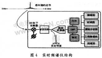 隨著數(shù)字射頻技術(shù)的發(fā)展,要求必須能捕獲并存儲(chǔ)一段時(shí)間的信號(hào),并可反復(fù)回放,分析信號(hào)隨時(shí)間的變化。另外,隨著頻譜利用率不斷提高,干擾將來自更臨近的頻點(diǎn),甚至同一頻率,這要求頻譜測(cè)試技術(shù)在發(fā)現(xiàn)和捕獲能力上實(shí)現(xiàn)本質(zhì)性的突破。實(shí)時(shí)頻譜儀的核心是基于快速傅里葉(FFT)的儀表,可以實(shí)時(shí)捕獲各種瞬態(tài)信號(hào),同時(shí)在時(shí)域、頻域及調(diào)制域?qū)π盘?hào)進(jìn)行全面分析,滿足現(xiàn)代數(shù)字射頻信號(hào)測(cè)試的需求,圖4所示為簡(jiǎn)化的實(shí)時(shí)頻譜儀結(jié)構(gòu)圖。