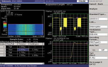 預編程測量能減少進行這些測試所需的建立時間。例如,ISO18000-6 C 類型的一個重要測量是啟動時間和關閉時間。載波能量上升時間必須足夠快以保證標簽采集到使其正常工作的充足能量。信號也必須迅速達到穩定狀態。發射結束時,載波能量下降時間必須足夠快,以防止其他發射受到干擾 [參閱圖3]。