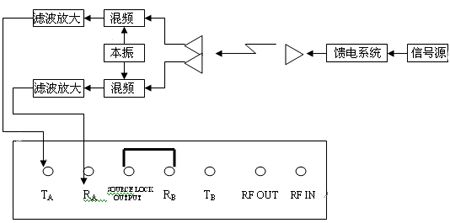 信號源輸出頻率為f1的信號,經天線陣列饋電系統后由天線輻射出去,兩個接收天線的接收信號經混頻變為頻率為f2的信號,再經濾波放大后分別饋入3630A的TA、、RA端。