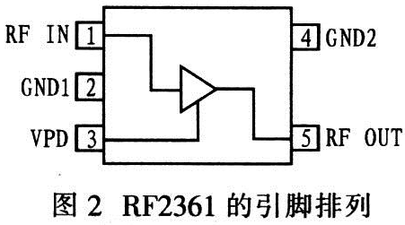 圖2為RF2361的引腳排列,其中:RF IN為低噪聲功率放大器輸入,需通過一阻抗匹配網絡達到50Ω阻抗匹配:RF0UT為低噪聲功率放大器輸出,也需通過一阻抗匹配網絡達到50Ω阻抗匹配;同時電源VCC給整個電路提供工作電壓。VPD用于控制偏置電流,與偏置電阻R1共同確定偏置電流。GND1、GND2為接地。