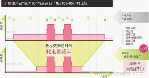 LAPIS Semiconductor去年推出的“ML7105”,實現了業界頂級的低耗電量(收發數據包時的運行狀態)。此次開發出的新品“ML7105-00x”,不僅保持了運行狀態下的低耗電量性能,而且平均電流還減少了一半。所謂平均電流,是指按一定間隔反復收發數據包時的運行狀態(耗電量大)與休眠狀態(耗電量小)的平均電流值。通過大幅減少改變狀態所需的時間,使平均電流減半,從而使電池壽命可達2倍。因此,按LAPIS Semiconductor的工況條件,支持Bluetooth® Low Energy的、使用紐扣電池(CR2032)的設備其電池壽命即使在24小時連續工作的條件下,也可充分使用2年。
