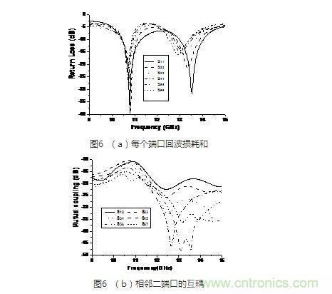 圖6給出了該相控陣前六個激勵端口的仿真回波損耗和和前七個天線的相鄰單元的耦合系數(shù)曲線??梢钥闯?,各個端口匹配良好,且互耦隨著間隔的增大而較小。