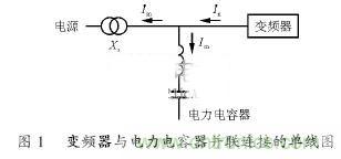 電力電容器由于諧波引起并聯(lián)諧振,則有異常電流流入電容器,其結果是導致電容器過熱,絕緣層被破壞。通常,當電源阻抗充分小(電源設備容量大)時產生的故障很少,但要考慮高次諧波對低壓電力電容的影響,因此可使用帶6豫串聯(lián)電抗器的電力電容器來減小諧波干擾,電抗器與電力容器、變頻器連接圖如圖1所示。