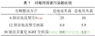 為了將諧波產生的種種干擾防患于未然,應該在發(fā)生源(變頻器)側抵制高次諧波。首先主電路可選擇采用多脈沖數(shù)整流、多電平輸出形式,諧波少對電網的污染也小,如表1 所列。從表中看出主電路整流脈波數(shù)多三電平輸出可達到高標準的要求。還可采用動態(tài)消除諧波的方法,當然成本就會增加,但要比較權衡。