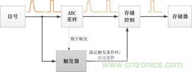 這就要靠觸發(fā)系統(tǒng)來實現。觸發(fā)的原理是一直監(jiān)控信號流,若發(fā)現信號滿足設定的觸發(fā)條件,觸發(fā)器記錄滿足條件的信號,啟動采樣;待數據采集完畢后,由控制器對信號進行處理和顯示。具體如下圖1所示。