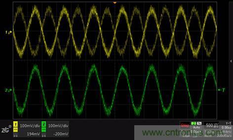 圖3 CH1不開啟高頻抑制觸發(fā)不穩(wěn),CH2開啟高頻抑制