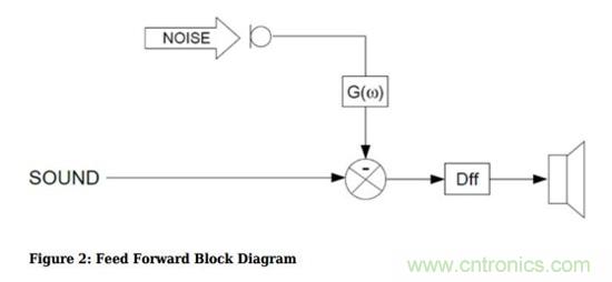 如果把系統畫成信號流圖,就是下圖,噪聲在麥克風采樣后進入信號處理電路,產生“反”噪聲,并與音樂一起送進耳機內。這種模式稱為前饋有源噪聲消除。