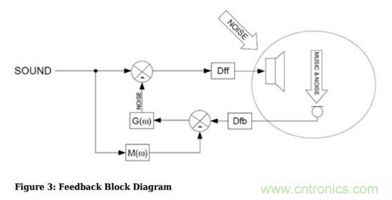 在反饋有源噪聲消除方案中,麥克風采樣的不是直接的環境噪聲,而是耳機輸出處的聲音,顯然這里的聲音包括了音樂和環境噪聲。那么如何選擇性地抵消掉噪聲但是保留音樂呢?就需要把這里采樣到的聲音減去音樂,這樣剩下的信號就全是噪聲了;然后再根據這個噪聲去產生噪聲抵消信號。這樣做的話,就不會有風噪問題。然而,這里又有一個新問題,就是反饋系統通常帶寬會遠小于前饋系統,因此使用反饋模式的有源噪聲消除對于高頻噪聲的抵消作用有限。