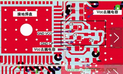 在本文的后面部分將會看到,PLL的實現在系統設計中總是面臨巨大挑戰,要想獲得滿意的雜散特性必須有良好的地線布局。目前,IC設計中將所有的PLL和VCO都集成到了芯片內部,大多數PLL都利用數字電流電荷泵輸出通過一個環路濾波器控制VCO。通常,需要用二階或三階的RC環路濾波器濾除電荷泵的數字脈沖電流,得到模擬控制電壓。靠近電荷泵輸出的兩個電容必須直接與電荷泵電路的地連接。這樣,可以隔離地回路的脈沖電流通路,盡量減小LO中相應的雜散頻率。第三個電容(對于三階濾波器)應該直接與VCO的地層連接,以避免控制電壓隨數字電流浮動。如果違背這些原則,將會導致相當大的雜散成分。