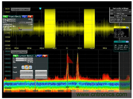 很多用慣了示波器的人都喜歡示波器的觸發功能,用各種觸發方式來隔離各種事件,穩定顯示,觀察異常。在傳統頻譜儀上是很難實現觸發的,但是當我們發現示波器的模板觸發方式,很容做到,把時域波形的實時頻譜變到頻域來觀察,借助MASK 測試的一些小工具,居然輕松設置和輕松觸發。因為模板的形狀自由編輯,觸發的動作自由組合,這樣的波形分析已經完全跨越的時域和頻域的使用習慣,完全融合了時域和頻域對信號的思維方法了。