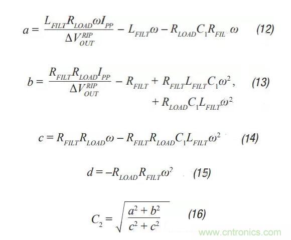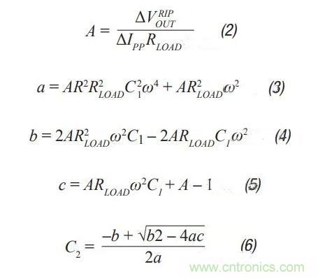 第3步:C2隨后可通過公式2至公式6計(jì)算得出。A、a、b和c是簡(jiǎn)化計(jì)算的中間值,沒有實(shí)際意義。這些公式假定R < />LOAD,且每個(gè)電容的ESR較小。這些都是很好的假設(shè),引入的誤差很小。C2應(yīng)等于或大于C1。可調(diào)節(jié)第1步中的紋波,使其成為可能。