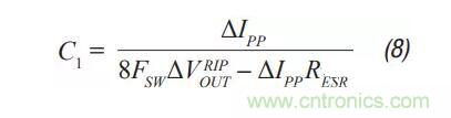 第1步:正如之前的拓?fù)洌x擇C1,使其等于沒有輸出濾波器時(shí)的情況。10 mV p-p至100 mV p-p是個(gè)不錯(cuò)的開始,具體取決于最終目標(biāo)輸出紋波。C1隨后可通過公式8計(jì)算得出。C1在這個(gè)拓?fù)渲锌梢圆捎帽戎巴負(fù)涓〉臄?shù)值,因?yàn)闉V波器效率更高。