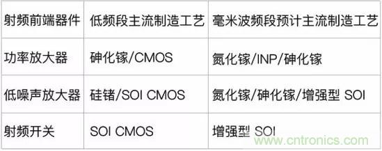 射頻前端器件包括了功率放大器、開關、濾波器、雙工器、低噪聲放大器等,其中功率放大器是最為核心的器件,其性能直接決定了終端的通信距離、信號質量及待機時間。目前制造支持低頻段的射頻前端器件的材料多為砷化鎵、CMOS和硅鍺。但由于毫米波段與低頻段差異較大,低頻射頻前端器件的制造材料在物理特性上將很難滿足毫米波射頻前端器件的要求。
