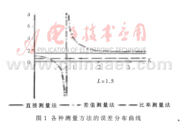 圖1表示取L=1.5時相對誤差隨元件值的分布情況??梢钥闯?,比率測量法在很寬的測量范圍內(nèi)均具有良好的抗干擾能力。當(dāng)存在多個影響因素或者在分析由上述方法組合成的測量裝置時,可根據(jù)疊加原理按系統(tǒng)誤差的理論綜合評定其精度。