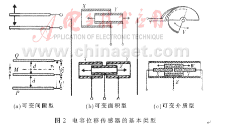 電容位移傳感器的三種基本類型如圖2所示。其具體結(jié)構(gòu)可視實際運用的場合靈活多變,電容極板可以是平面的或者球面的;運動電極可以采用水銀等導(dǎo)電液體。圖2所示的三種基本類型均可組成差動式結(jié)構(gòu),如各分類中下部圖形所示。采用差動式結(jié)構(gòu)能夠提高傳感器線路的輸出靈敏度,減小非線性,還能在一定程度上抑制由靜電吸引帶來的誤差。當(dāng)要求測量系統(tǒng)具有很高的分辨力時,一般是保持極板面積相對固定而使電容傳感器極板間隙隨被測位移改變,即如圖2(a)所示的結(jié)構(gòu)。反之,采用保持間隙恒定而讓極板相對面積可變的結(jié)構(gòu),則可以在相當(dāng)大的動態(tài)范圍內(nèi)獲得線性的響應(yīng)[1]。