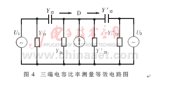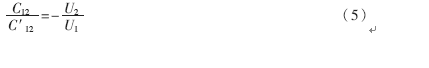 如果將兩個三端電容串接起來,分別用兩個信號源供電,就形成了如圖4所示的等效電路,其中,Y12=jωC12,Y′12=jωC′12。在公共點D與接地端之間連接一個檢流計,調(diào)節(jié)兩個外加電壓的幅值和相位,使通過兩個直接電容流向D點的電流大小相等、方向相反,直道檢流計指零,便可得到下面的關(guān)系式: