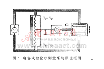 現(xiàn)以設(shè)計一個測量微小位移的系統(tǒng)為例來說明上述測量方法的應(yīng)用。首先,用高導(dǎo)磁率環(huán)形鐵芯繞制出感應(yīng)耦合比率臂,再設(shè)計適當(dāng)?shù)目勺冮g距三電極差動式電容位移傳感器的結(jié)構(gòu),并采用比率測量線路,就有如圖5所示的微位移測量系統(tǒng)原理框圖。對雙極板電容傳感器,不考慮電場的邊緣效應(yīng),兩個直接電容為:C12=